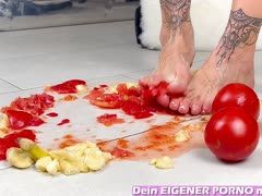 Deutsche Fuß Fetischisten mit Tattoos spielt mit Essen